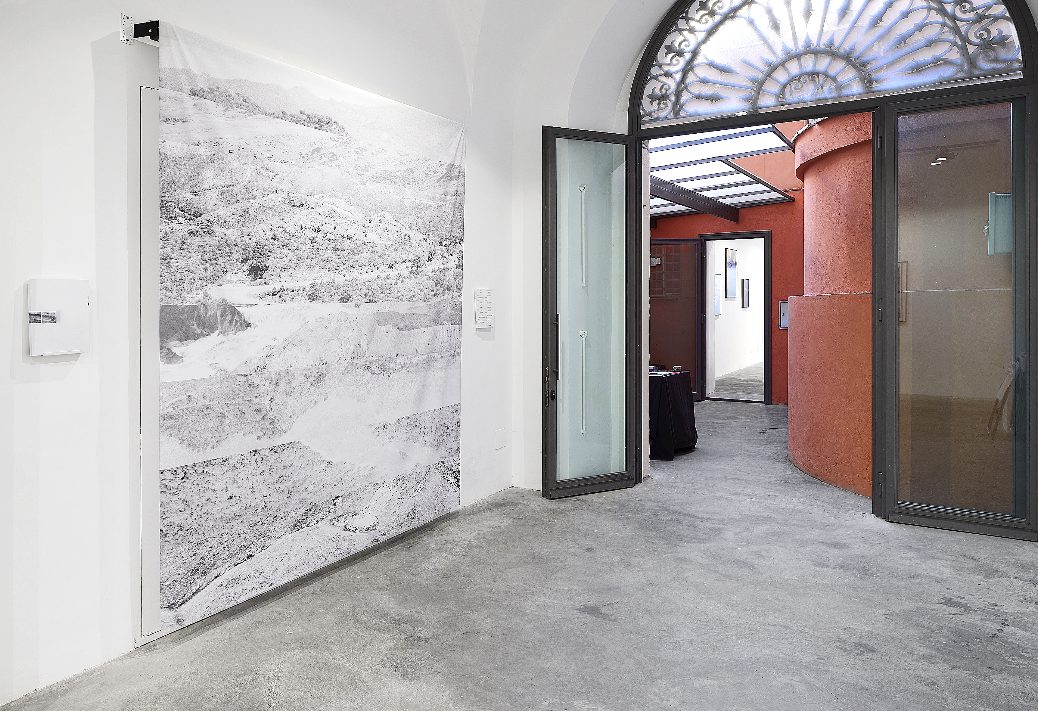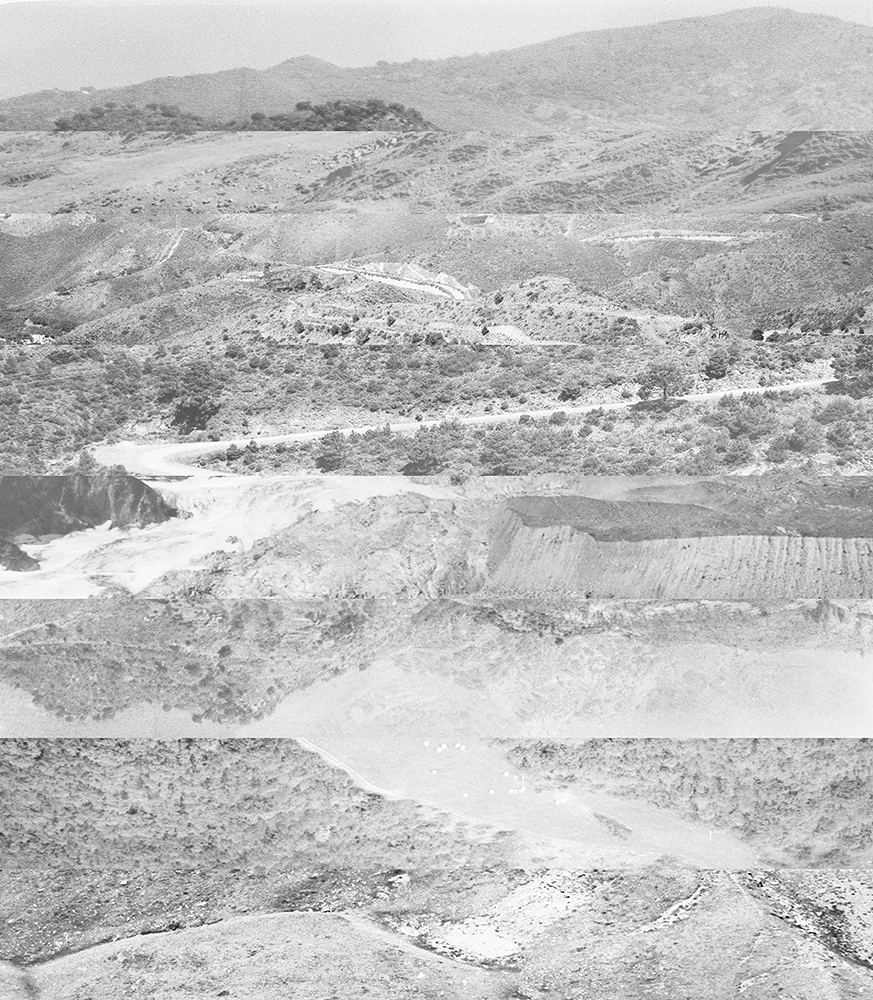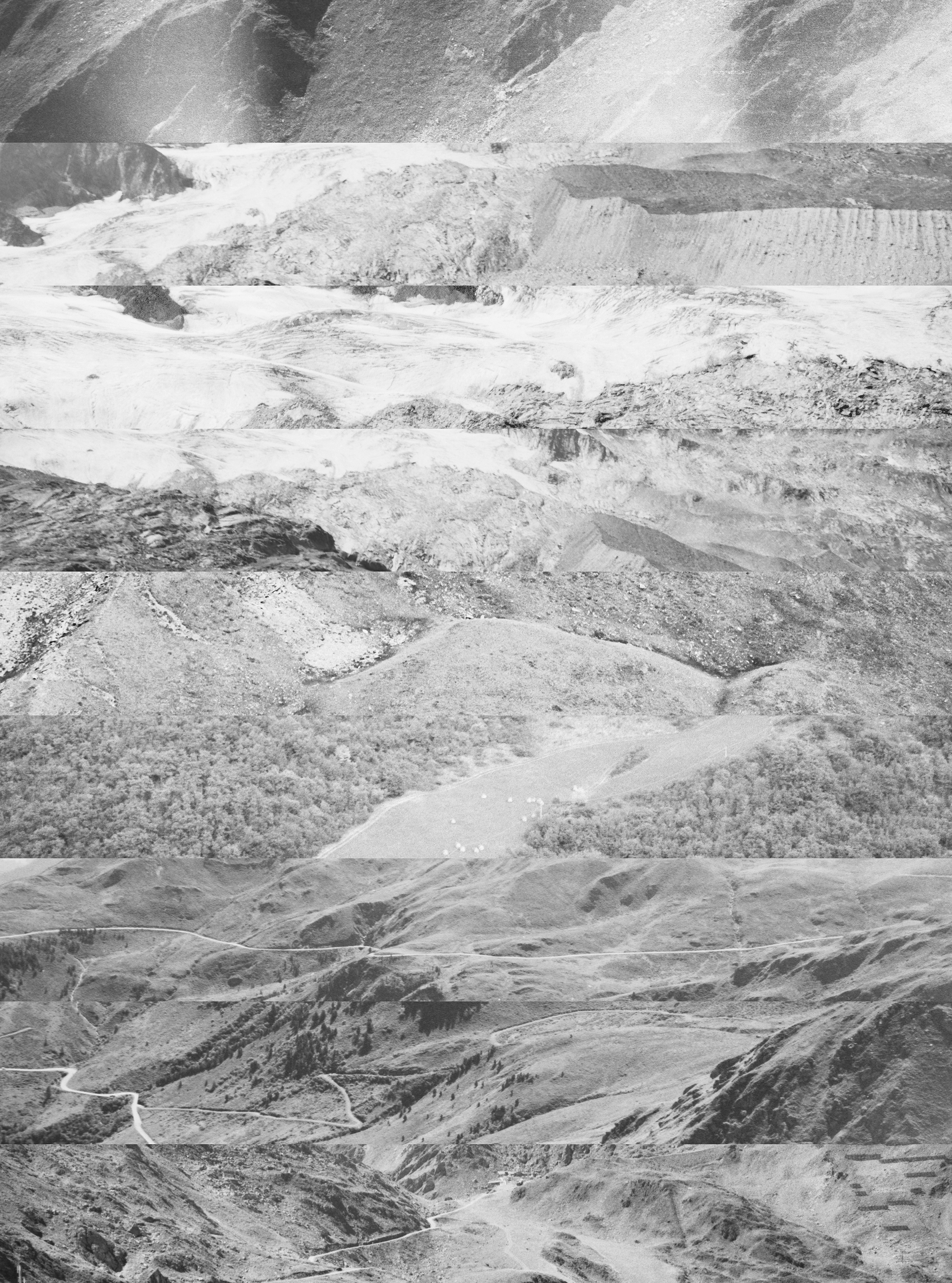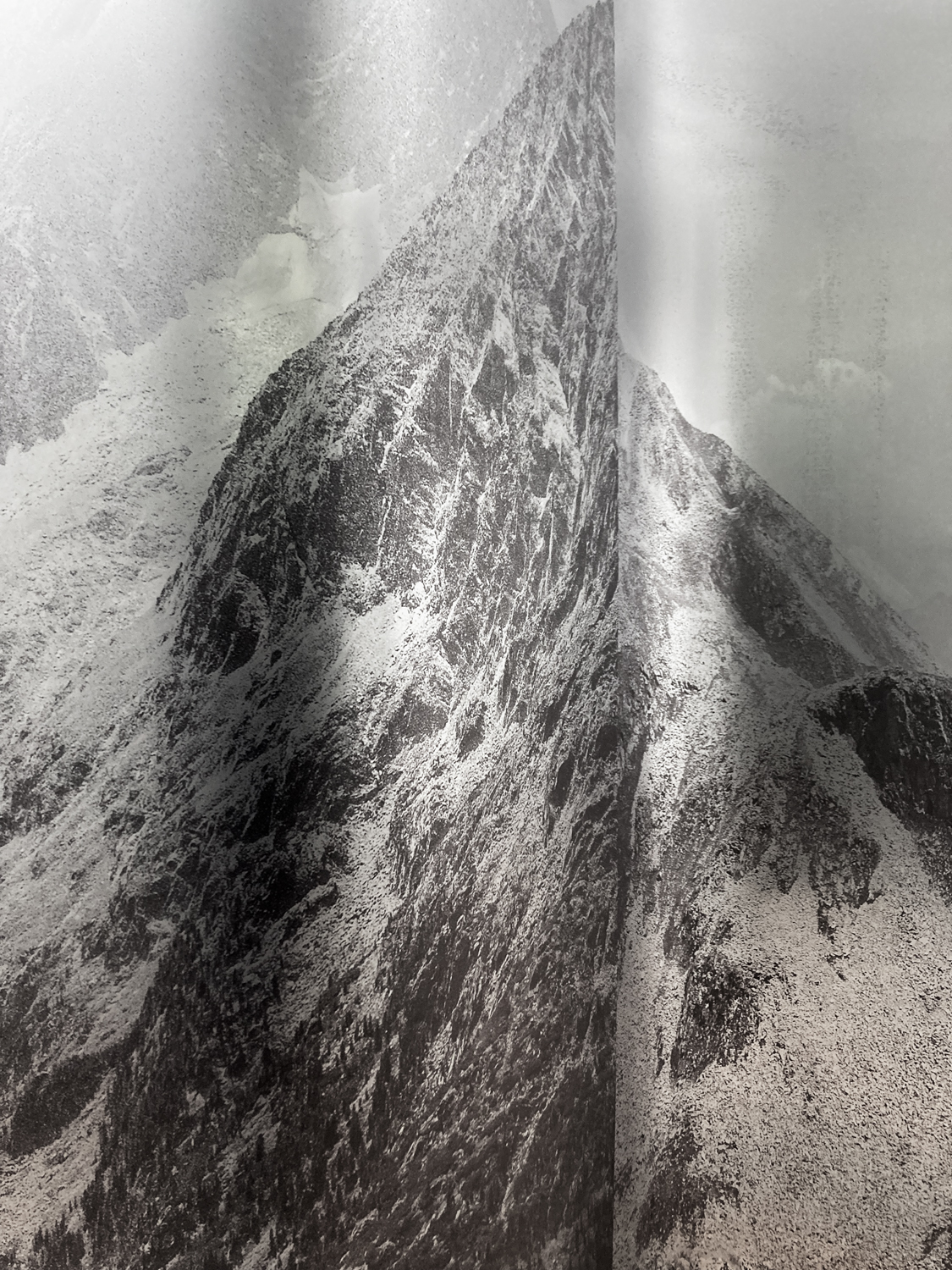 3) Along Sightlines is a monumental wall-based composition constructed from fragments of images sourced from entirely different real-world locations. Through rescaling, cropping, zooming, and repositioning, the images converge into a new, imagined landscape. The spatial logic of the work shifts with each step the viewer takes, creating a rhythm of appearance and disappearance.