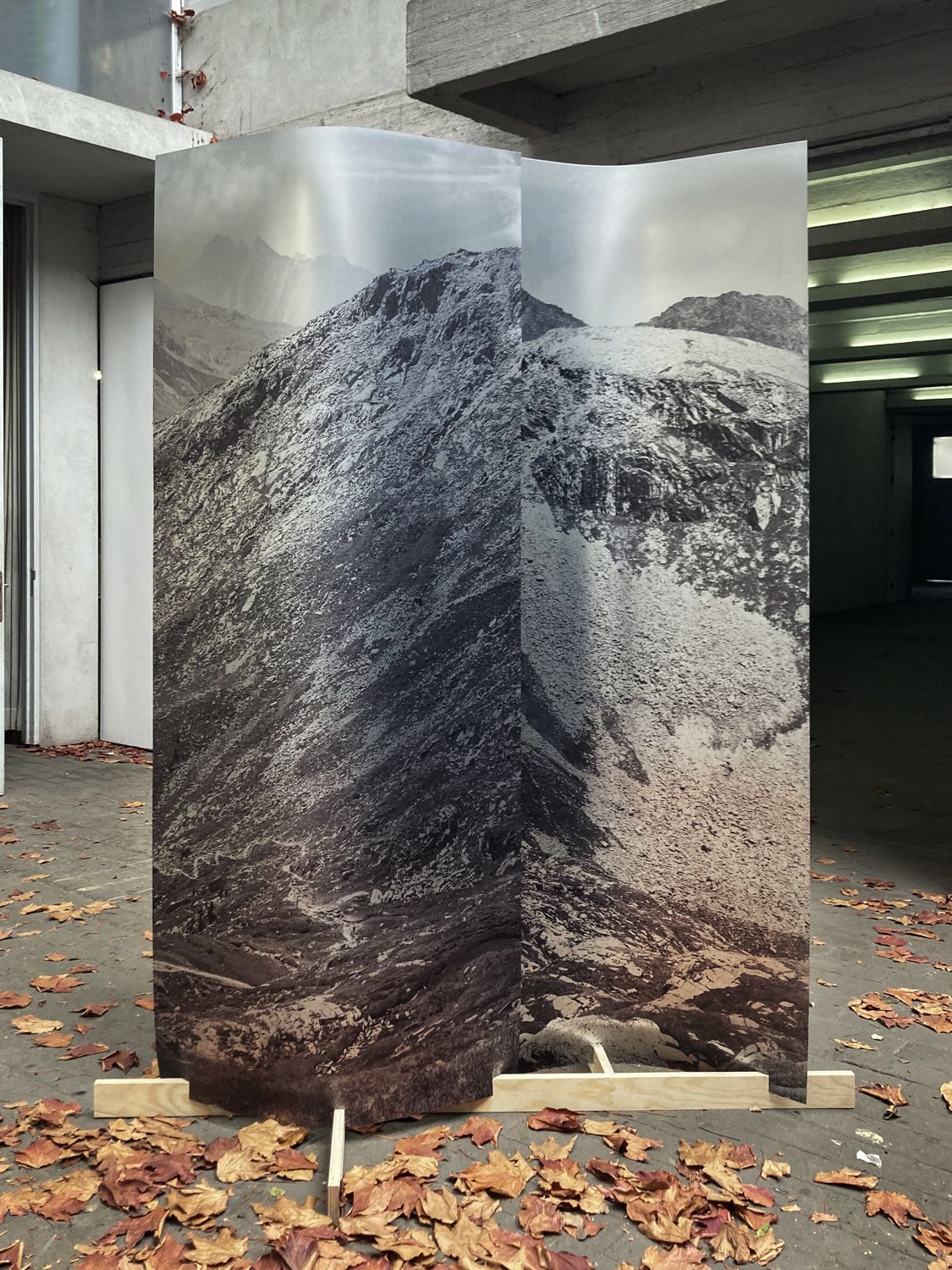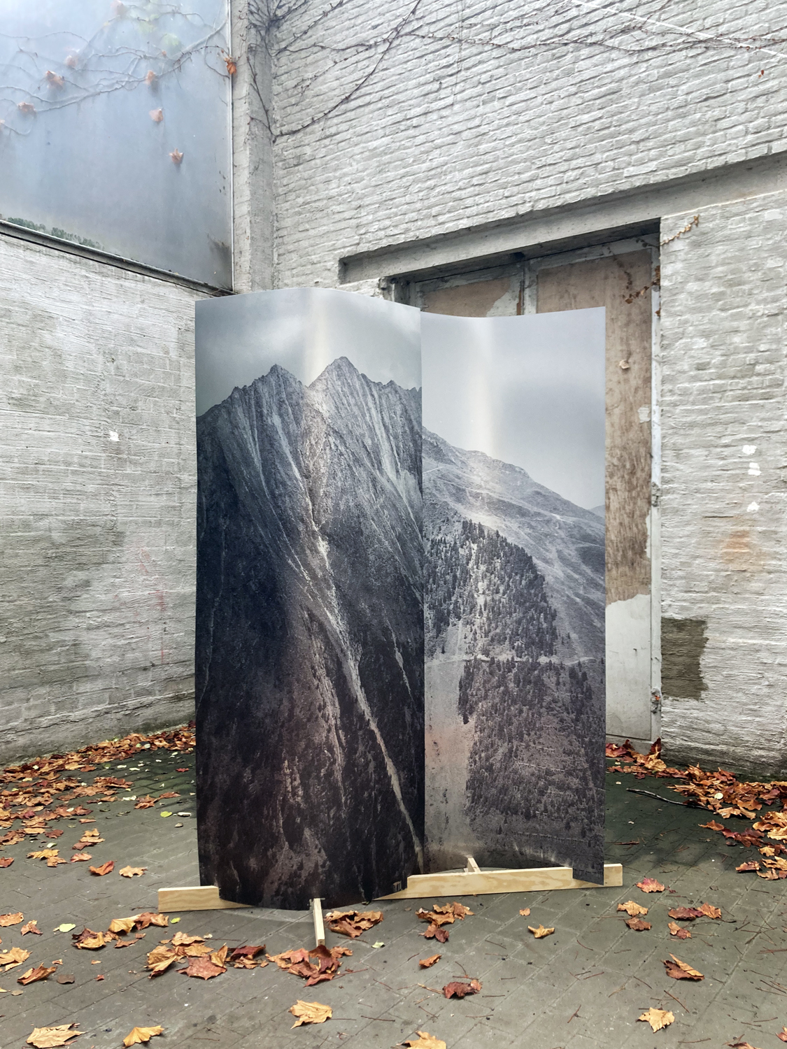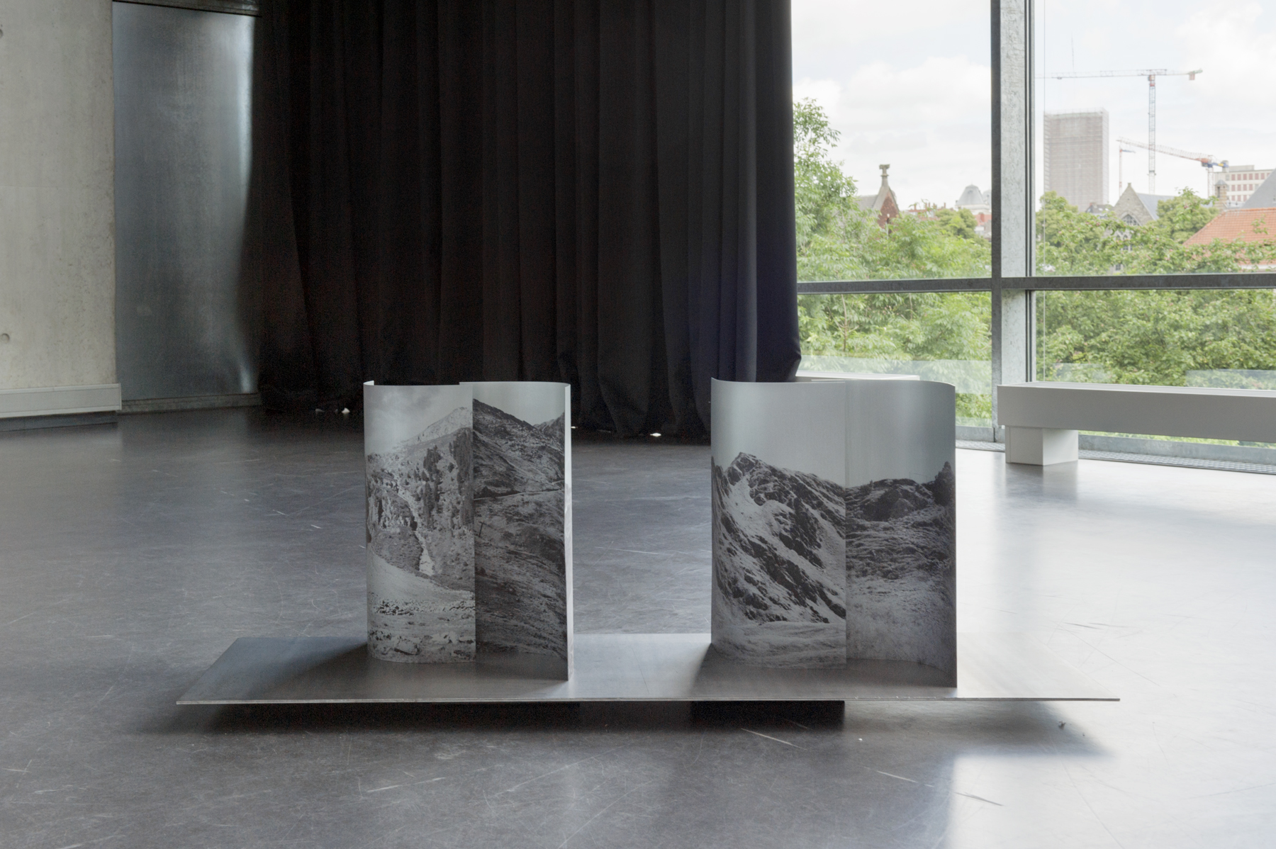 2) A choreography consists of a series of bent zinc plates. Each plate features images that reveal shifting perspectives through physical folds, creating a dynamic interplay between surface and depth. Placed side by side, the plates form a fragmented yet continuous landscape that transforms as the viewer moves around it. The still images are never truly still, constantly shifting in perception, animated by the viewer’s own movement through space.