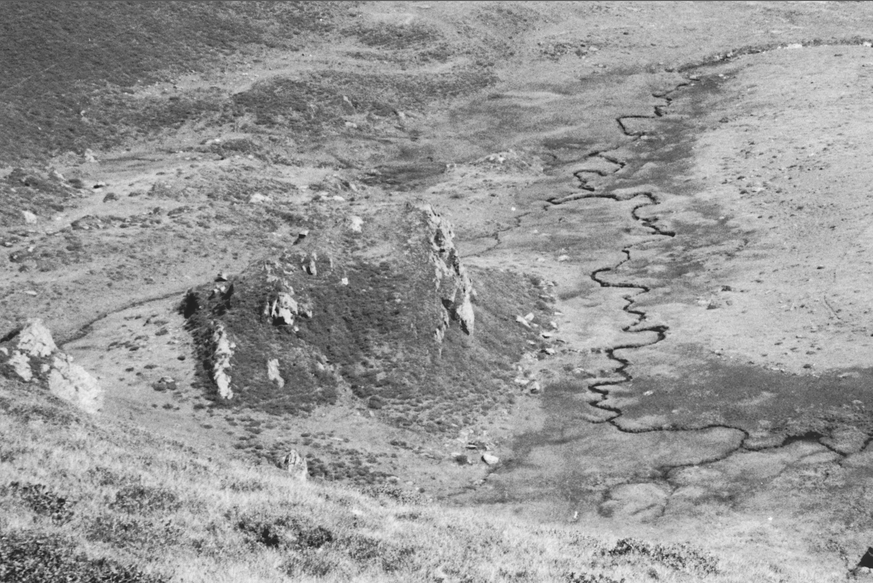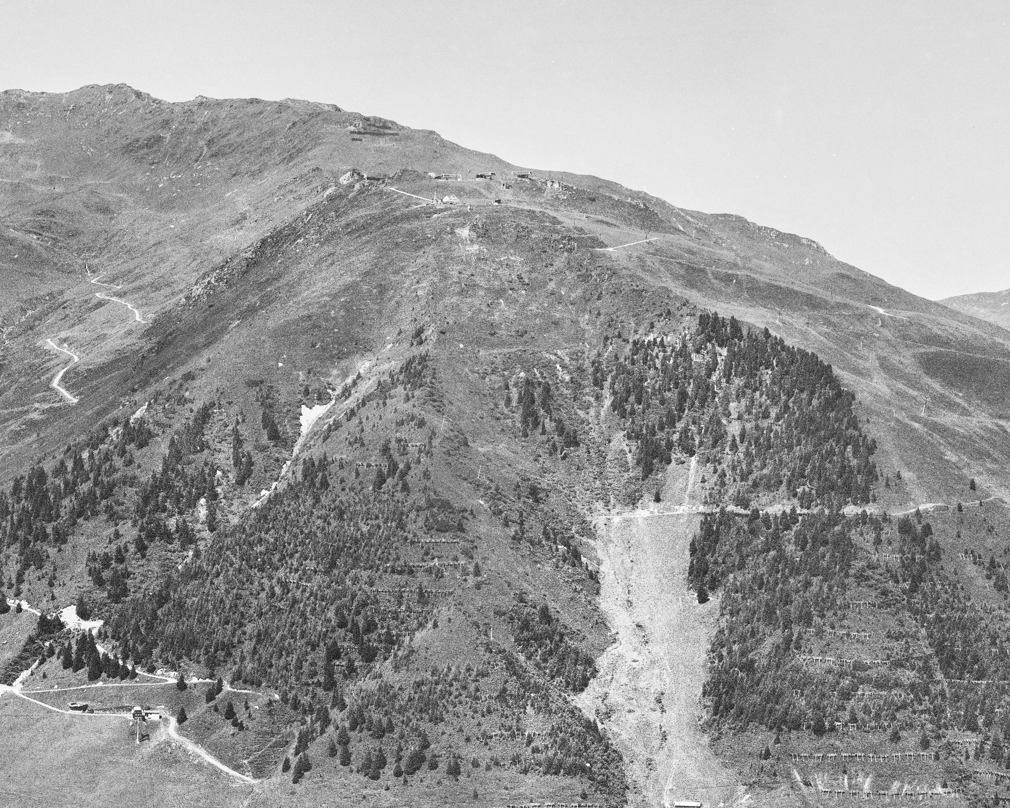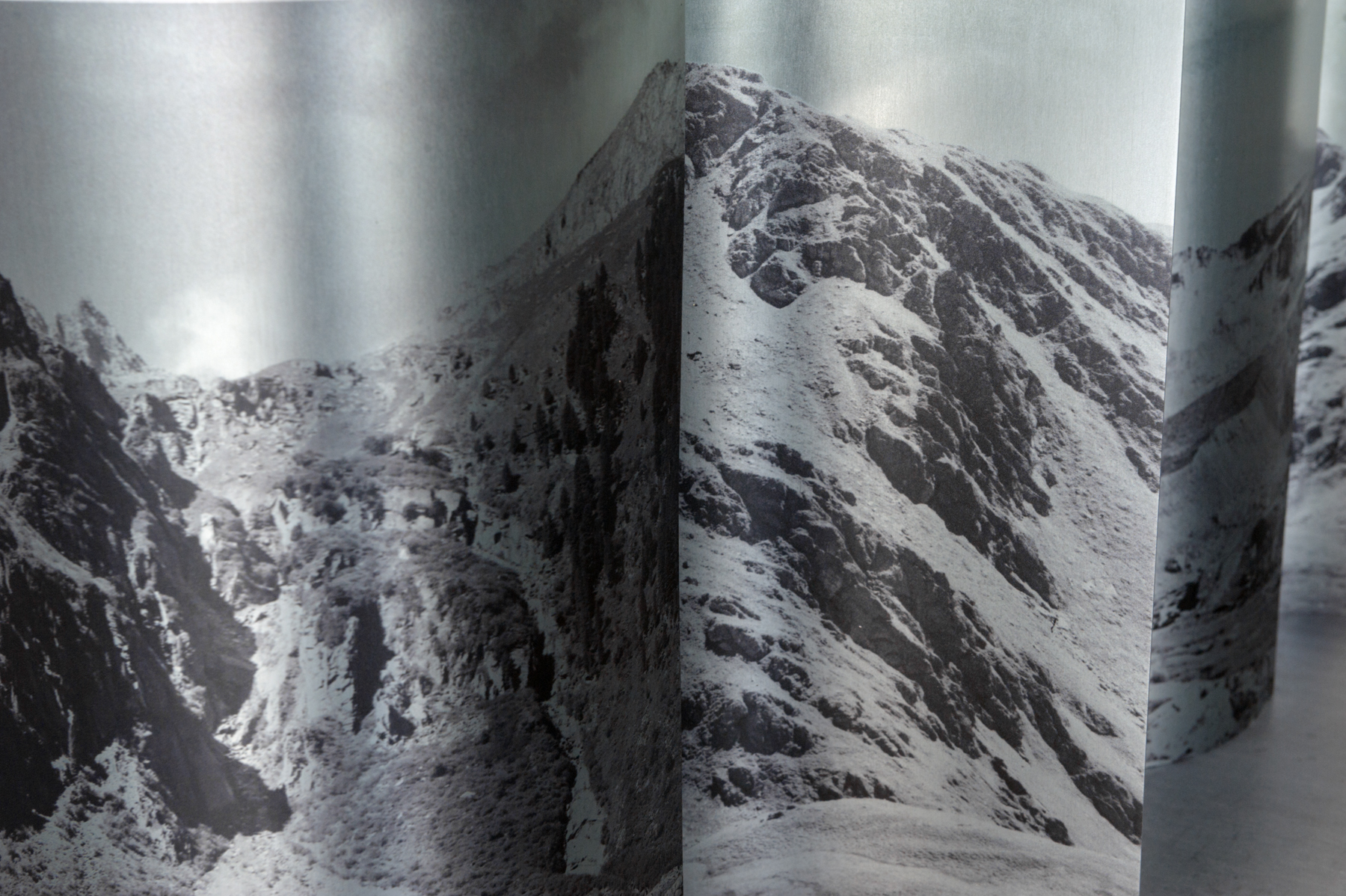 2) A choreography consists of a series of bent zinc plates. Each plate features images that reveal shifting perspectives through physical folds, creating a dynamic interplay between surface and depth. Placed side by side, the plates form a fragmented yet continuous landscape that transforms as the viewer moves around it. The still images are never truly still, constantly shifting in perception, animated by the viewer’s own movement through space.