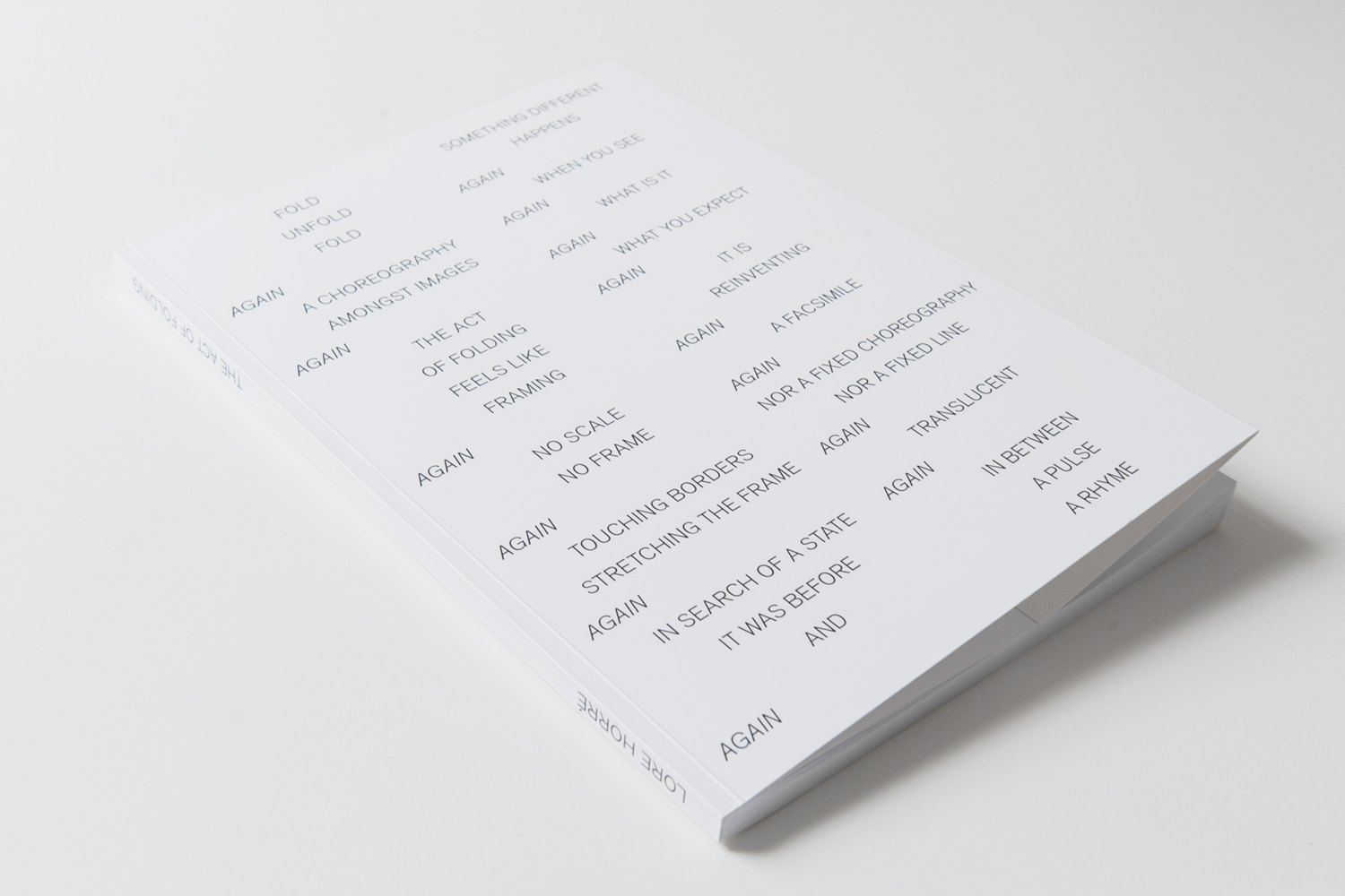 act of folding is a book that serves both as a manual and a work in itself. It contains an inventory of all the images generated or used throughout the process of Fold Unfold Fold Again, accompanied by a text that playfully narrates the working process. The book offers insight into the visual logic of the project, inviting the viewer to interpret the works through both image and language.